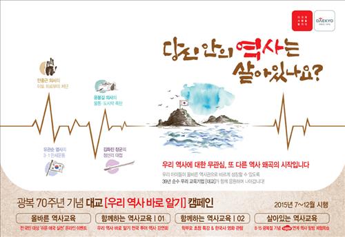 (서울=연합뉴스) 고유선 기자 = 대교는 광복 70주년을 맞아 학생들이 올바른 역사의식을 가질 수 있도록 올해 말까지 '우리 역사 바로 알기 캠페인'을 벌인다고 23일 밝혔다.