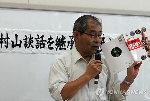 | △ 2014년 8월 7일 '무라야마담화를 계승·발전시키는 모임'이 일본 도쿄도(東京都) 참의원 회관에서 연 기자회견에서 다카시마 노부요시(高嶋伸欣) 류큐(琉球)대 명예교수가 이쿠호샤(育鵬社)의 역사 교과서를 들고 전쟁 책임 문제에 관한 기술에 대해 문제를 제기하고 있다.(연합뉴스 자료사진) |