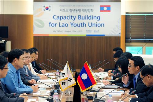 (성남=연합뉴스) 강성철 기자 = 정부 무상원조 전담기관인 한국국제협력단(코이카)의 김영목 이사장은 23일 경기도 성남시 코이카 개발협력역사관에서 라오스 청년동맹의 빌라이봉 부다캄 사무총장과 간담회를 열고 양국 간 교류 협력 방안을 논의했다.