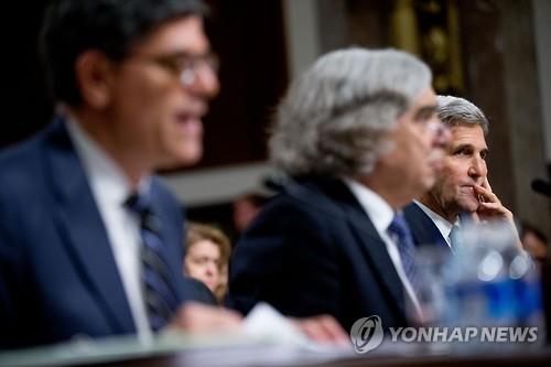 | △ 존 케리 미국 국무장관(맨 오른쪽), 어니스트 모니즈 에너지장관(가운데), 제이컵 루 재무장관이 23일 열린 상원 외교위원회 청문회에 출석해 증언하고 있다. |