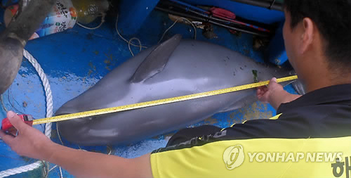 | △ 진해 앞바다서 죽은채 발견된 상괭이 (창원=연합뉴스) 창원해양경비안전서 직원이 24일 오전 경남 창원시 진해구 잠도 앞바다에서 그물에 걸려 죽은 채 발견된 상괭이를 조사하고 있다. 2015.7.24 <<창원해양경비안전서>> seaman@yna.co.kr |