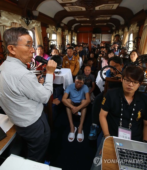 | △ 유라시아 친선특급에서 강연하는 이병무 평양 과기대 교수 (페름<러시아>=연합뉴스) 김도훈 기자 = 25일(현지시간) 오전 러시아 예카테린부르크를 출발해 모스크바를 향해 달리는 유라시아 친선특급 열차 안에서 평양 과학기술대 이병무 치과대학 설립학장이 특별 강연을 하고 있다.2015.7.25 superdoo82@yna.co.kr |