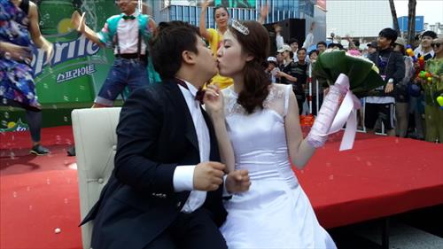 축제 마지막날 오후 7시께. 연세로 한가운데의 노상무대에서 이색 결혼식이 열려 눈길을 모았다. 화제의 주인공은 여인욱(31) 씨와 김연홍(26) 씨. 이들은 이날 물총축제를 통해 신혼부부로 새롭게 태어났다.