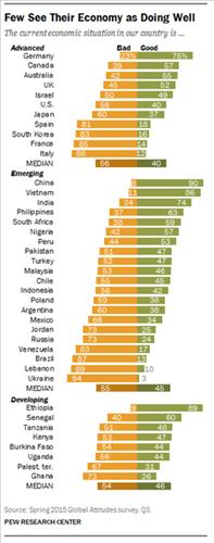 퓨리서치센터는 지난해 조사 결과와 비교했을 때 한국에서 경제 상황이 좋다는 응답률이 17%포인트 감소했다며, 말레이시아나 러시아부터 독일에 이르기까지 세계 여러 나라에서 각국 국민들의 체감 경제 수준이 지난 1년간 위축됐다고 설명했다.