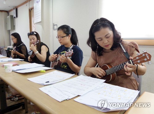 | △ 우쿨렐레 연주하는 '뮤즈맘' (서울=연합뉴스) 고현실 기자 = 22일 서울 금천구다문화가족지원센터에서 자조모임 '뮤즈맘' 회원들이 우쿨렐레를 연습하고 있다. 중국계 이주여성으로 구성된 '뮤즈맘'은 지난 2월부터 한 달에 두 차례 만나 우쿨렐레를 배우고 있다. 2015.7.27 okko@yna.co.kr |