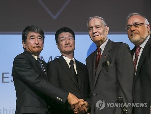 | △ (AP=연합뉴스) 일본 미쓰비시머티리얼의 오카모토 유키오 사외이사(왼쪽)와 기무라 히카루 상무(왼쪽 두번째)가 2015년 7월 19일(현지시간) 미국 로스앤젤레스에서 2차대전 당시 일본군 포로로 붙잡혀 강제노역했던 전 미군 병사 제임스 머피(94) 씨의 손을 붙잡고 사죄하고 있다. |