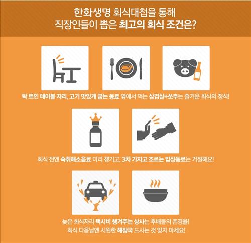 27일 한화생명[088350]이 지난달 25일부터 한 달간 공식 페이스북(www.facebook.com/hanwhalife)에서 최고의 회식 조건을 주제로 직장인 1만8천618명을 대상으로 설문조사한 결과에 따르면, 회식 메뉴로 삼겹살과 소주가 좋다는 응답이 65%로 치킨과 맥주(35%)를 선택한 답변보다 많았다.