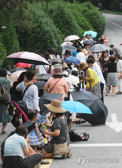 | △ 배용준 결혼식 기다리는 팬들 (서울=연합뉴스) 홍기원 기자 = 배우 배용준과 박수진이 웨딩마치를 울리는 27일 오후 결혼식장인 서울 광진구 광장동 쉐라톤 그랜드 워커힐 애스톤하우스 주변에 팬들이 모여 있다. 2015.7.27 xanadu@yna.co.kr |