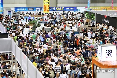 | △ '떨이 세일'에 몰린 인파…롯데백화점 킨텍스 행사장 / (고양=연합뉴스) 임병식 기자 = 휴일인 26일 일산 킨텍스에서 진행 중인 롯데백화점의 '롯데 블랙 슈퍼쇼(LOTTE BLACK SUPER SHOW)' 행사장에 몰린 인파. 23∼25일 사흘간 매출은 85억3천만원을 기록했고 이 기간 64만명이 킨텍스 행사장을 찾은 것으로 집계됐다. 2015.7.26 |