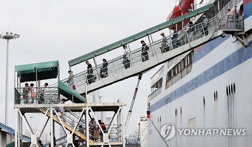 | △ 정부가 사실상 국내 중동호흡기증후군(메르스) 종식을 선언한 가운데 27일 오후 인천시 중구 인천항으로 중국 관광객들이 입국하고 있다. |