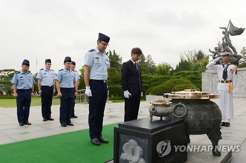 | △ 묵념하는 호주공군 77대대 방문단 (서울=연합뉴스) 6·25전쟁 65주년을 맞아 한국 공군을 방문하기 위해 입국한 호주공군 77대대 방문단이 지난 27일 국립서울현충원을 방문, 묵념하고 있다. (공군 제공) |
