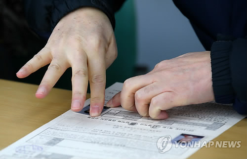 | △ 지난 2월 제1차 초·중·고졸 검정고시 응시 접수를 위해 서울 용산공업고등학교를 찾은 한 수험생이 원서에 사진을 붙이고 있다. (연합뉴스 자료사진) |