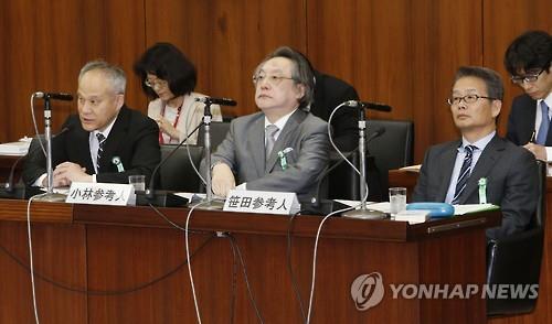 | △ 하세베 야스오(長谷部恭男) 와세다(早稻田)대 교수(왼쪽), 고바야시 세쓰(小林節) 게이오(慶應)대 명예교수(가운데), 사사다 에이지(笹田榮司) 와세다대 교수(오른쪽)가 집단 자위권 용인 방침을 반영한 안보 법률 제·개정안 심사를 위해 2015년 6월 4일 중의원 헌법심사회에 참고인으로 출석한 모습.(교도=연합뉴스) |