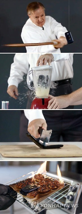 | △ 그레이엄 의원, 트럼프 도발에 '휴대전화 갈아부수기' 영상으로 맞불 (서울=연합뉴스) 미국 공화당 대선후보 자리를 노리는 부동산 재벌 도널드 트럼프와 린지 그레이엄(공화·사우스캐롤라이나) 상원의원의 장외 대결이 점입가경으로 치닫고 있다. 트럼프가 지난 21일(현지시간) 사우스캐롤라이나 주 유세에서 그레이엄 의원의 휴대전화 번호를 공개하는 기행을 저지르자, 그레이엄 의원은 휴대전화기를 갖가지 방법으로 부수는 영상을 인터넷에 공개했다. 영상에서 휴대전화기를 공중에 매달아 놓은 뒤 목검으로 후려치거나, 믹서기에 넣어 에너지 음료와 함께 갈아버리고, 도마 위에 올려놓고 고기절단용 대형 식칼로 내려치고, 오븐에 넣어 태우는 장면을 올렸다. 2015.7.23 << 유튜브 캡처 >> photo@yna.co.kr |
