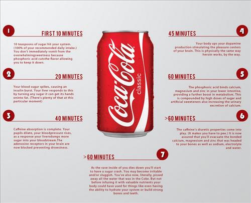 '진실을 처방한다'는 기치를 내걸고 의료 정보를 제공하는 '약사 변절자'(http://therenegadepharmacist.com)라는 웹사이트는 콜라 섭취 후 벌어지는 몸의 증상을 10∼20분 간격으로 요약해 그래픽에 담았다.