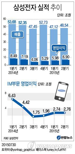 삼성전자는 30일 연결기준으로 매출 48조5천400억원, 영업이익 6조9천억원의 2015년 2분기 확정실적을 발표했다.