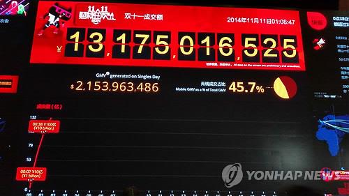 | △ (항저우=연합뉴스) 중국 최대 전자상거래 업체인 알리바바가 2014년 11월11일 '독신자의 날'을 맞아 저장성 항저우에 있는 본사에서 할인행사를 개시했다. 사진은 초반 매출이 폭발적으로 증가하는 상황을 보여주는 전광판. |