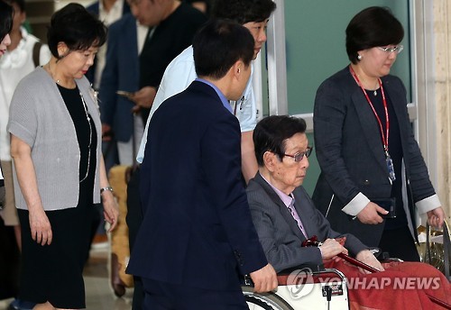 | △ 신격호 롯데그룹 총괄회장의 장녀인 롯데복지재단 신영자 이사장(맨 왼쪽)이 28일 오후 휠체어에 탄 신 총괄회장과 함께 김포국제공항을 통해 귀국하고 있다. |