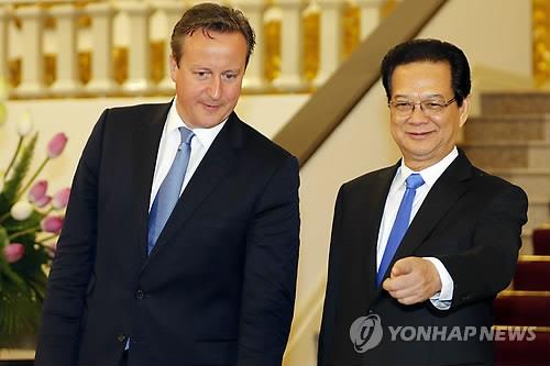 | △ (하노이 EPA=연합뉴스) 베트남을 처음으로 방문한 데이비드 캐머런 영국 총리(왼쪽)가 29일(현지시간) 하노이에서 기자회견을 앞두고 응웬 떤 중 총리와 대화하고 있다. |