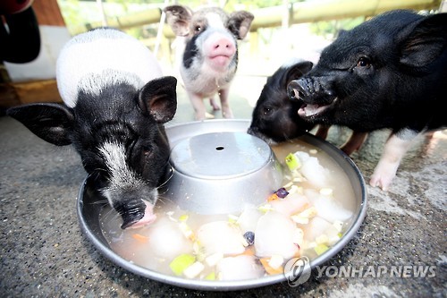 | △ 얼음과일 파티하는 미니돼지 가족 (울산=연합뉴스) 이상현 기자 = 울산지역에 닷새째 폭염경보가 발령된 31일 울산대공원 동물원의 미니돼지 가족이 얼음과일 파티를 하고 있다. 2015.7.31 leeyoo@yna.co.kr |