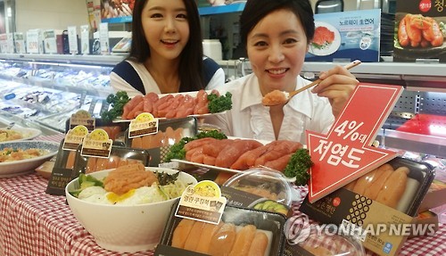 | △ 롯데마트, 명장이 만든 저염 명란젓 (서울=연합뉴스) 2일 롯데마트 서울역 점에서 모델들이 부산창조경제혁신센터에서 추천한 '장석준 명장(수산제조직종 명장 1호, 고용노동부)'이 만든 웰빙 저염 명란 젓갈 2종을 선보이고 있다. 일반 명란젓의 염도가 7~15%인데 반해 장석준 명장이 만든 명란은 화학 첨가제가 없는 4% 대의 웰빙 저염 명란이다. 2015.6.2 << 롯데마트 제공 >> photo@yna.co.kr |