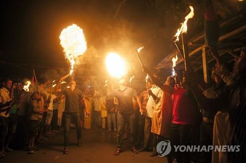 | △ 1일 0시가 넘어 방글라데시 다시아르차라 마을이 인도령에서 방글라데시 영토로 이전되자 주민들이 이른바 '불쇼'를 하면서 환호하고 있다.(AFP=연합뉴스) |