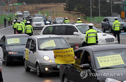 | △ 지난 2012년 서울외곽순환고속도로 북부구간 통행료 인하를 촉구하며 시민단체 회원들이 서행투쟁을 하며 서울외곽순환고속도로 고양IC 요금소 진입로에 들어서고 있다. (연합뉴스 자료사진) |