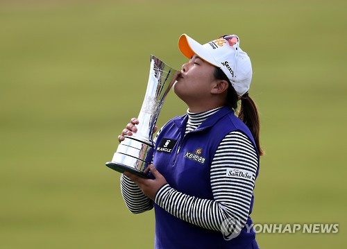 | △ Inbee Park of South Korea poses with the trophy after winning the Women's British Open golf championship at the Turnberry golf course in Turnberry, Scotland, Sunday, Aug. 2, 2015. (AP Photo/Scott Heppell) |