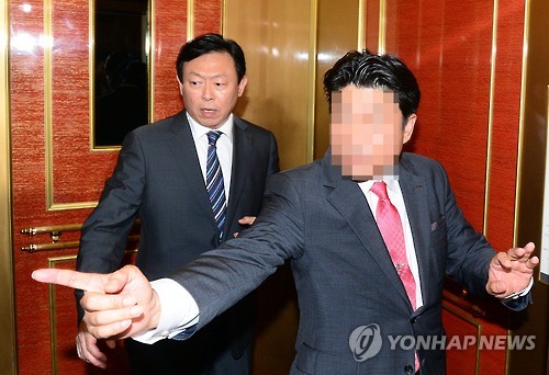 | △ 롯데호텔 들어서는 신동빈 회장 (서울=연합뉴스) 한종찬 기자 = 롯데그룹의 경영권을 둘러 싼 다툼의 끝이 보이지 않고 있는 가운데 신동빈 롯데그룹 회장(왼쪽)이 3일 오후 서울 소공동 롯데호텔 신관 엘리베이터에 오르고 있다. 이 호텔 신관 34층에는 신격호 롯데그룹 총괄회장의 집무실이 위치해 있다. |