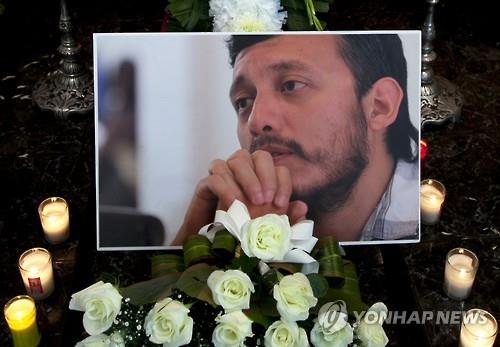 | △ 지난달 31일(현지시간) 피살당한 멕시코 주간지 프로세스의 사진 기자 루벤 에스피노사의 사진이 장례식장에 걸려있다.(AP=연합뉴스) |