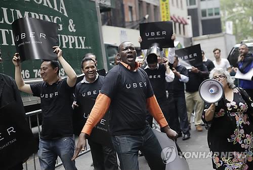 | △ '우버', 무서운 성장세 (뉴욕 AP=연합뉴스) 사진은 지난 5월28일 '유사 콜택시 서비스' 우버의 운전기사들과 그 지지자들이 뉴욕 택시 및 리무진 위원회 사무소 앞에서 시위를 벌이고 있는 모습. 우버는 7월말 현재 4년만에 2만6천명 이상의 운전기사를 확보했다. |