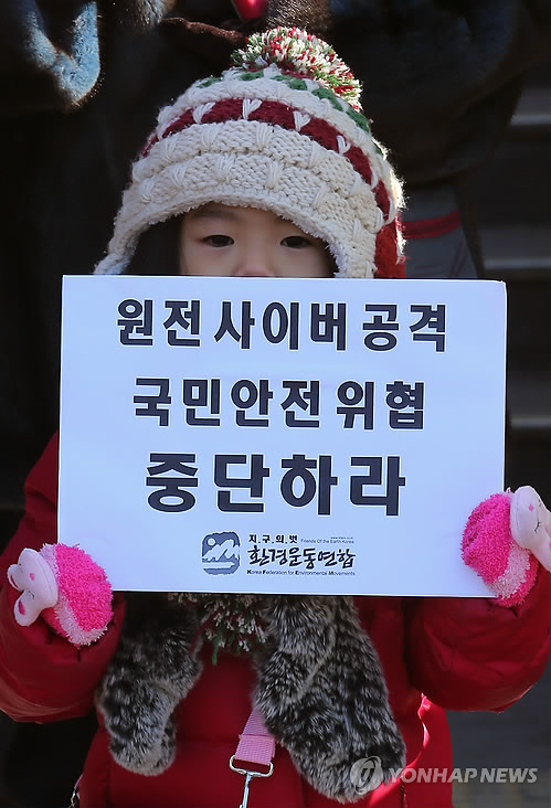 | △ 원전 사이버 공격 협박 중단하세요 (서울=연합뉴스) 황광모 기자 = '원전반대그룹'이라는 해커들이 원전 가동중단을 요구한 시한인 25일 오후 서울 광화문 원자력안전위원회 앞에서 월성 1호기 원전 수명연장 반대 캠페인을 벌이던 환경운동연합 회원을 따라온 어린이가 사이버 공격을 통한 통전 안전 위협 중단을 촉구하며 피켓 시위를 벌이고 있다. 환경운동연합은 매주 목요일 점심시간에 노후 원전 수명연장에 반대해 서명운동을 벌여 왔다. 2014.12.25 hkmpooh@yna.co.kr |