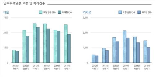 같은 기간 특정 ID의 접속 시간, 접속 서비스, IP주소 등 통신사실에 대한 확인 요청은 카카오가 661건 중 519건, 다음이 2천234건 중 995건이 처리됐다.