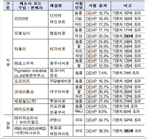 DEHP가 검출된 제품 중 모델상사의 협립비옷은 기준치의 290배, 하나슈즈의 '뽀로로 패턴라이트' 장화는 기준치의 385배가 넘는 DEHP가 나왔다.