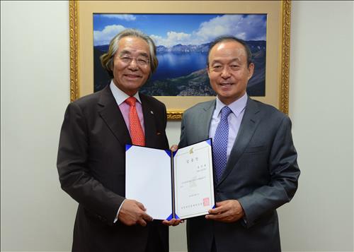 | △ 북한대학원대학교는 4일 봉두완 통일TV방송 이사장(왼쪽)을 석좌교수로 임명했다고 밝혔다. |