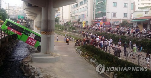 | △ 상계역 앞 지나던 마을버스 하천으로 추락 (서울=연합뉴스) 이효석 기자 = 4일 오후 서울 노원구 상계동 상계역 근처에서 마을버스가 도로를 이탈해 하천으로 떨어졌다. 현재 파악된 부상자 경상으로만 14명이다. |