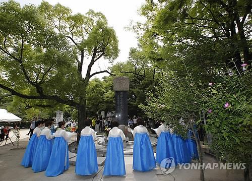 | △ 히로시마 평화기념공원안 한국인원폭희생자위령비 앞에서 지난 2013년 8월5일 열린 위령제. |