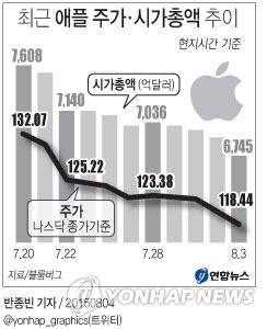 애플 주가가 떨어진 것은 지난달 2분기 아이폰 판매량이 전문가들의 예상을 밑돌았기 때문이라고 AP 통신 등은 분석했다.