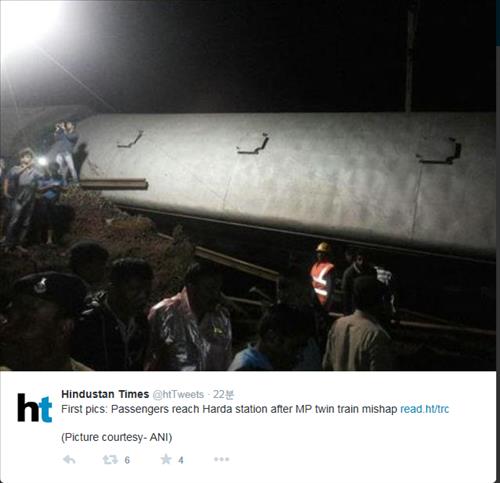 | △ 4일 오후 11시30분께 인도 중부 마디아프라데시 주에서 열차 탈선 사고가 발생했다. 사진은 현지 일간 힌두스탄타임스가 트위터에 올린 탈선 현장 모습<<힌두스탄타임스 트위터캡처>> |