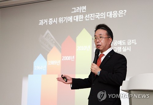 | △ 중국 투자 대응법 설명하는 서명석 유안타증권 대표이사 사장 (서울=연합뉴스) 서명석 유안타증권 대표이사 사장이 5일 여의도 한국거래소에서 중국 증시 간담회를 열고 중국 투자 대응법을 설명 하고 있다. (유안타증권 제공) |