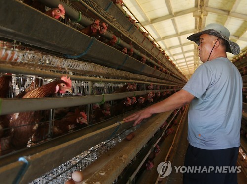 | △ '죽지마라 얘들아' (김제=연합뉴스) 임채두 기자 = 5일 오후 전북 김제시 용지면 용수리에서 양계장을 운영하고 있는 조덕곤(54)씨가 축사 내부를 둘러보고 있다. 2015.8.5 doo@yna.co.kr |