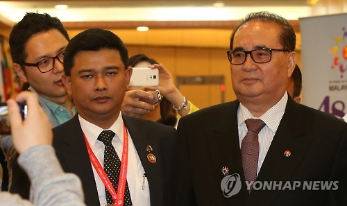 | △ 북한 리수용, 파키스탄과 양자회담 (쿠알라룸푸르=연합뉴스) 박동주 기자 = 리수용 북한 외무상이 5일 아세안지역안보포럼(ARF) 등 아세안(ASEAN) 관련 회의가 열리는 말레이시아 쿠알라룸푸르 푸트라세계무역센터(PWTC)에서 파키스탄과의 양자회담을 위해 이동하고 있다. |
