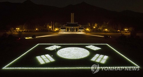 | △ 2만5천개 LED 조명등으로 만든 태극기 (대전=연합뉴스) 이재림 기자 = 지난 5일 저녁 대전 유성구 국립대전현충원 현충광장에 조성된 태극기 형상의 '보훈의 빛'이 어둠을 밝히고 있다. '보훈의 빛'은 광복 70주년 기념사업추진위원회 사업의 하나로, 발광다이오드(LED) 조명등 2만5천개를 사용해 만들었다고 대전현충원 측은 설명했다. 2015.8.6 |