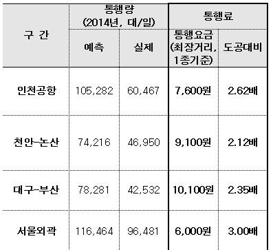 인천국제공항고속도로 통행료는 7천600원으로 2.62배, 대구부산고속도로는 1만100원으로 2.35배, 천안논산고속도로는 9천100원으로 2.12배 비싸다.