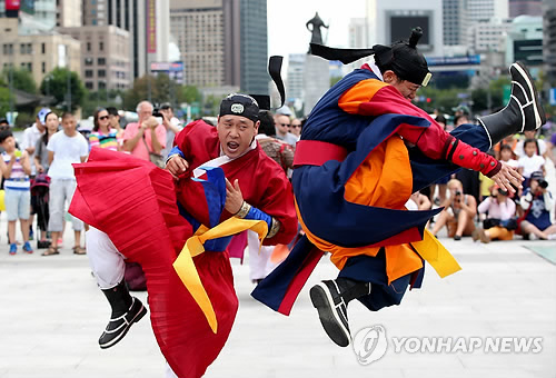 | △ 한산대첩 축제 홍보, 24반 무예 (서울=연합뉴스) 홍해인 기자 = 2일 오후 서울 세종대로 광화문광장에서 '제53회 통영한산대첩 축제'를 홍보하기 위한 '미리 보는 축제'에 참가한 행사 참가자들이 스물네가지 기예로 구성된 24반 무예 시범을 보이고 있다. 충무공 이순신 장군의 한산대첩 승리를 기리는 통영한산대첩축제는 오는 13일부터 17일까지 경남 통영시 일대에서 개최된다. 2014.8.2 hihong@yna.co.kr |