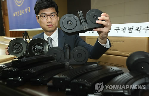 | △ 전략물자 탄창 3만개 밀수출 예비역 장교 등 일당 적발 (서울=연합뉴스) 서명곤 기자 = 서울지방경찰청 국제범죄수사대는 외국으로 탄창을 불법 수출한 혐의(대외무역법 위반)로 7명을 붙잡아 예비역 소령 이모(41)씨와 군수품 제조업자 노모(50)씨를 구속하고 현역 소령 양모(38)씨 등 5명을 불구속 입건했다고 13일 밝혔다. 사진은 13일 마포구 마포경찰서에서 경찰이 압수한 탄창을 정리하는 모습. 2015.5.13 seephoto@yna.co.kr |