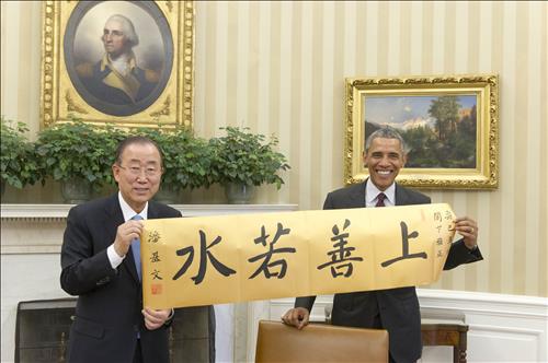 반 총장이 오바마 대통령에게 직접 상선약수 휘호를 건넨 것은 오바마 대통령의 생일인 지난 4일(현지시간) 백악관 집무실에서다.