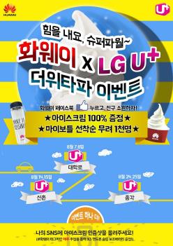 현장 이벤트는 혜화(7~8일), 신촌(14~15일), 종각(24~25일)에 있는 LG유플러스[032640] 공식 대리점에서 즉석 이벤트로 진행된다. 화웨이 컨슈머 코리아 공식 페이스북(facebook.com/huaweikoreaconsumer) 페이지를 방문해 '좋아요'를 누른 모든 참여자에게 현장에서 아이스크림 또는 화웨이 텀블러를 준다.