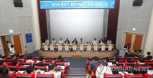 제주도는 7일 오후 제주웰컴센터에서 '바람으로 달리는 전기자동차의 글로벌 메카 제주, 전기차 중장기(2015∼2030) 종합계획(안)'을 발표하고 도민 공청회를 했다.