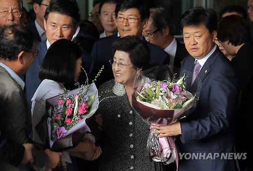 | △ 이희호 여사 귀국 (서울=연합뉴스) 이정훈 기자 = 3박 4일간의 방북 일정을 마친 이희호 여사가 8일 오후 김포공항을 통해 귀국, 환영객들로 부터 꽃다발을 받고 있다. |